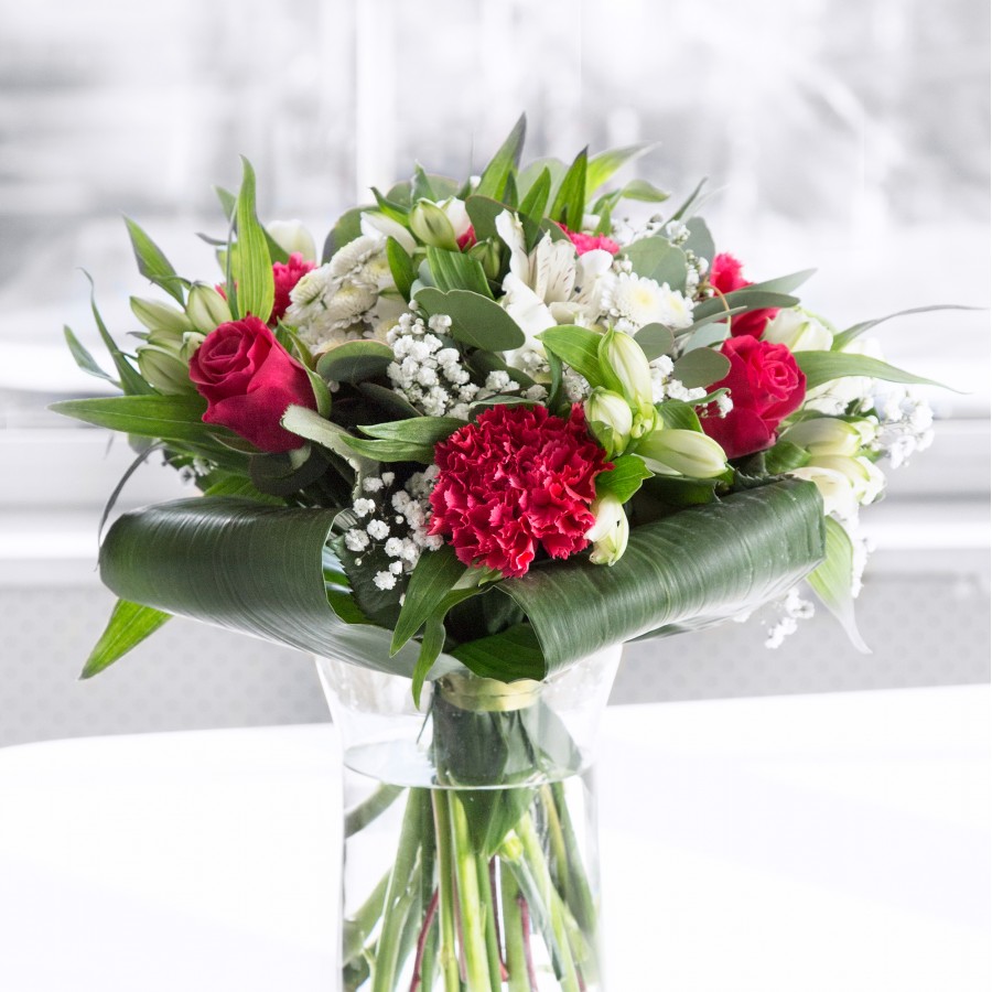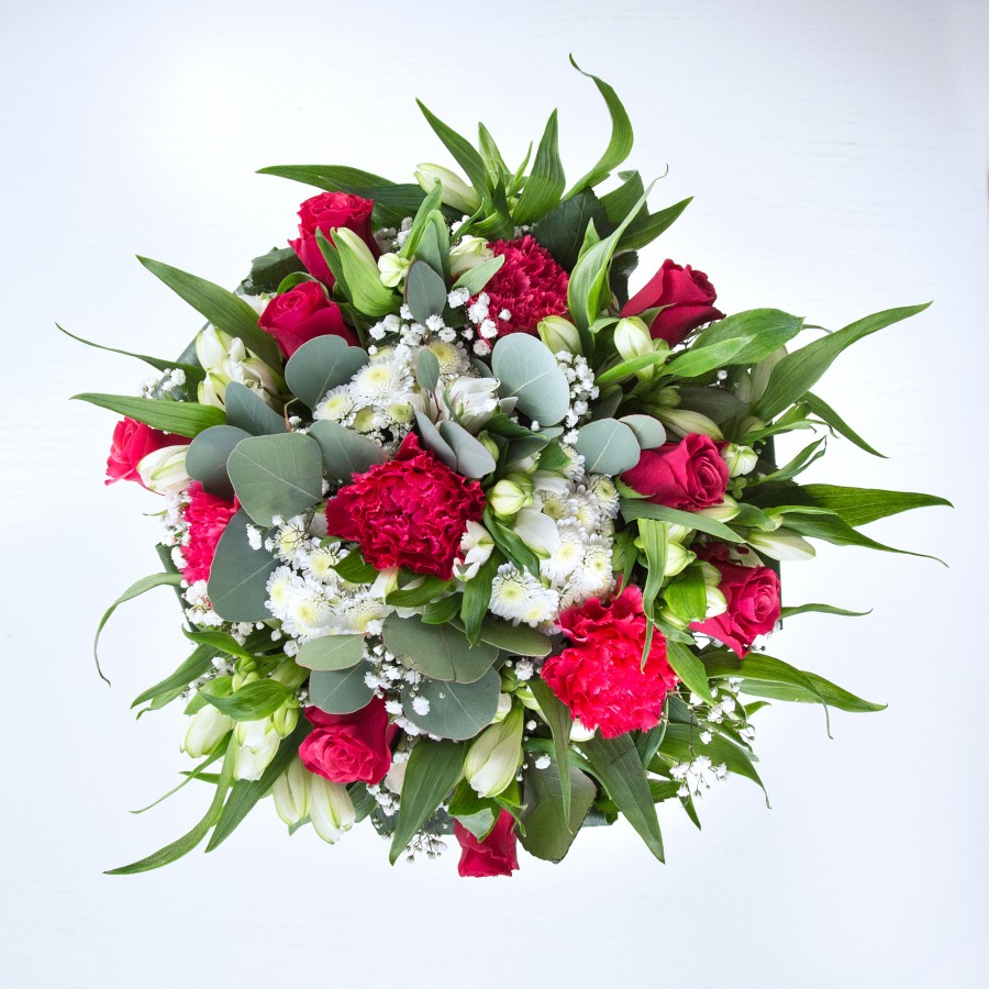 Dive into the splendor of our exquisite bouquet, designed to spark creativity and delight. Featuring pure white chrysanthemums, delicate gypsophila, stunning red roses, cheerful carnations, pristine white alstroemeria, and vibrant aspidistra leaves, each element is carefully arranged to create a harmonious display.